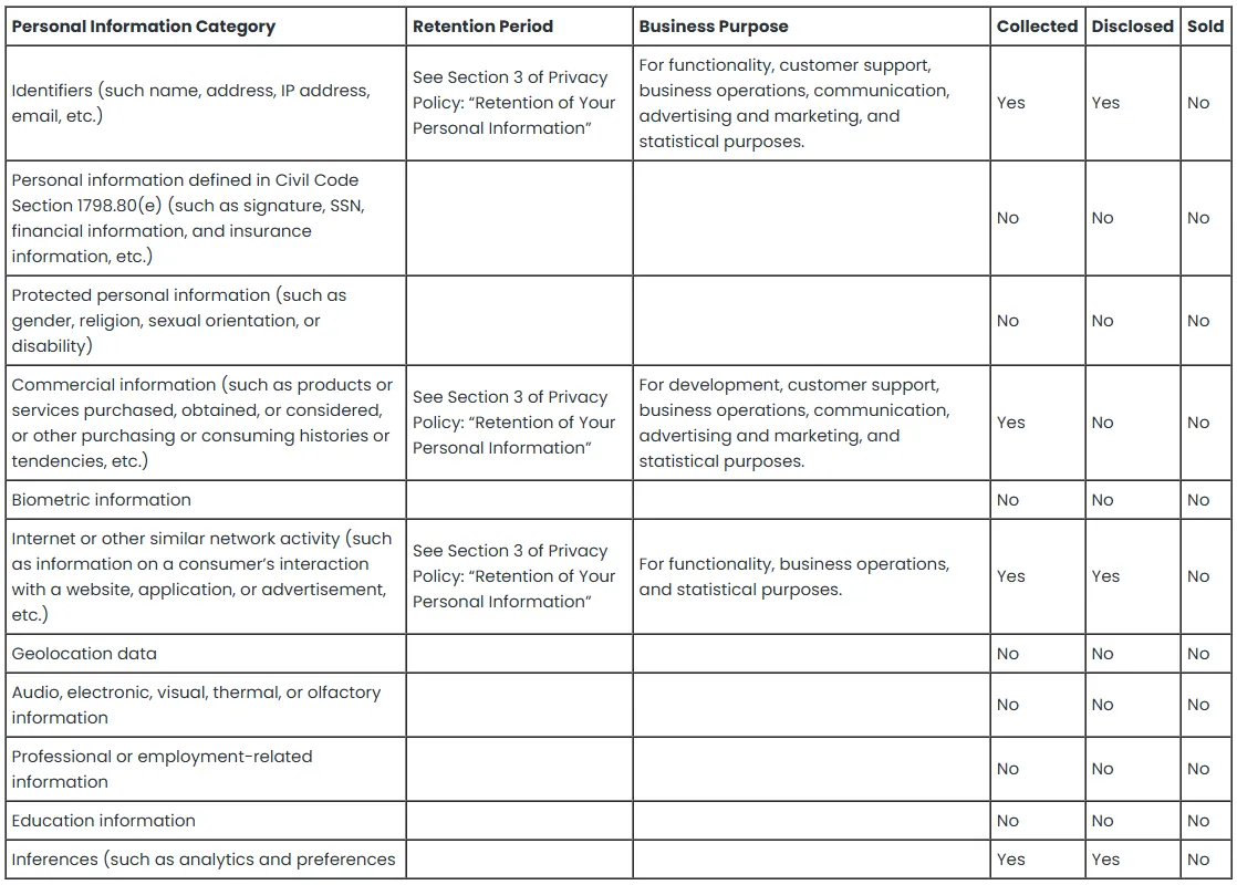 The categories of Personal Information collected, disclosed, and sold from California residents over the preceding 12 months and applicable retention periods include: